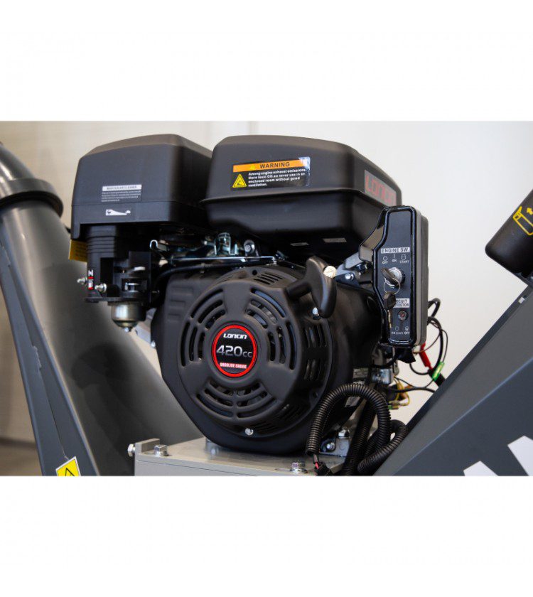 Masin töötab 420 cc bensiinimootoriga (15 hj) ja sellel on elektriline starter, mis muudab käivitamise väga lihtsaks. Purustamine toimub trumlilõikuriga, millel on 2 nuga ja 1 vastunuga, tagades puhta ja kiire tulemuse.